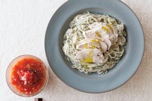 さっぱりとした鶏胸肉は冷たい汁と麺と相性抜群。フルーティな梅の香りとトマトの酸味がきいたつゆは、食欲がなくても箸が進む美味しさです