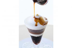 ふわふわのミルクの泡の下はバニラアイスクリーム。コニャック入りの生クリームやサクサクのチョコレート、コーヒーゼリーなどを何層にも重ねた。熱々のエスプレッソをかけてどうぞ。
