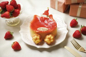 華やかな色合いのいちごのねこねこチーズケーキ。やさしい味わいのいちごのチーズケーキにいちごジャムが甘酸っぱいアクセント。いちご好きな人におすすめしたいケーキ。