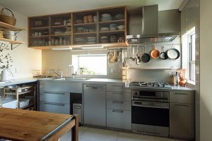 吊り戸棚は、作り付け。棚の素材はステンレスで揃えず木を採用、キッチンの雰囲気をやわらかい印象に。床は、汚れがつきにくく、掃除がしやすい60センチ角のタイルをチョイス。