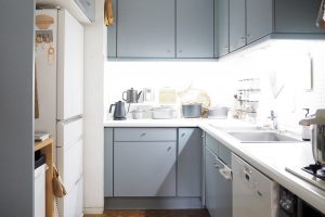 「最近はシンクの上の吊り棚や下の収納の扉を、ペンキを調合してもらい好きな色に塗り替えました。青みがかったグレーが今の気分にぴったりで、ますます気持ちが上がる場所に」
