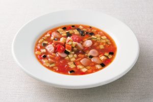 南仏プロヴァンス生まれの色鮮やかな夏野菜の煮込み、ラタトゥイユを酸味のほどよく効いたスープにアレンジ。トマトのリコピンは抗酸化作用が高く、赤パプリカに含まれるβ-カロテンと2つ一緒に摂ることでパワーアップ。オリーブオイルで炒め煮するので、さらにβ-カロテンやリコピンの吸収率が高まります。