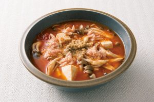 2.鍋に鶏むねスープとトマト缶を入れて、5分ほど中弱火で温める。フツフツしてきたらツナ、しめじ、豆腐を加えて、Aで味つけをする。
