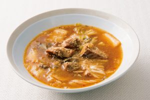 サバのみそ煮缶を使えば味つけ不要で、キムチと絶妙にマッチします。サバは脳を活性化させるDHAが含まれる「健脳食」。キムチの乳酸菌は腸内環境を整え、便秘改善などが期待できます。