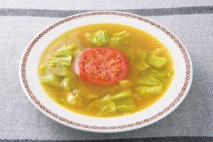 3.2が沸騰寸前になったら、弱火にしてキャベツを加えて煮込み、洋風スープの素、塩で味をととのえる。器に盛り、トマトをのせる。