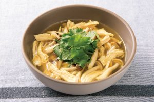 2.鍋に鶏むねスープとカレー粉、しめじを入れて中火で温める。沸騰寸前で弱火にし、鶏むね肉とパクチーの茎を加えて火を通し、ナンプラーで味をつける。
