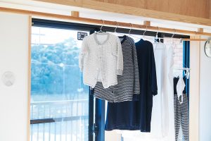 リビングの窓に沿って作り付けた長い木製バー。「賃貸物件に住んでいた時は、物干しスタンドやドアハンガーなどを使っていました。室内干しに便利で、夫の帰宅後、スーツを一時的に掛けておくのにも活用します」(本多さん)