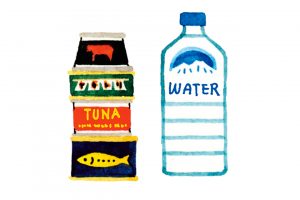 災害時は食欲も減退。食べ慣れた食品、好物で保存しやすいものを選ぶとよい。水は命をつなぐもの。分散して備蓄する。