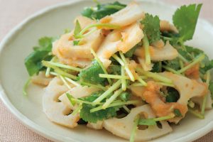 いちょう切りにしたゆでれんこんと三つ葉を、ほぐした明太子、しょうゆ、ごま油で和える。