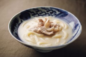 豚肉を出汁に、豆乳と長芋を加えて、とろみをつけたとんこつ風のスープ。まろやかな味わいで胃袋も満足。冷凍うどんで作れるから、夜食にもおすすめ。