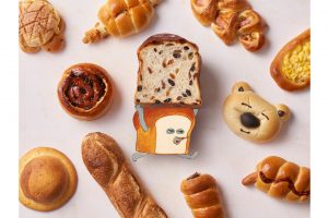 コラボパンの代表作は「パンどろぼうのぶどう食パン」。国産の小麦・生クリーム・マスカルポーネを使用した生地に2種のレーズンをたっぷり練り込んだ。奥久慈卵のカスタードクリームを使用した、見た目もかわいい「しろくまパン」や、作中でも見逃せないシーンに登場する、自家製のルヴァン種を使用した「パン オ レザン」、キタノカオリの生地に“ちくわ”を合わせ食べるという、2度ビックリ! な「ちくわパン」、さらにイベリコ豚のベーコンを贅沢に使用したソフト生地の「ベーコンエピ」など、全11種を用意。