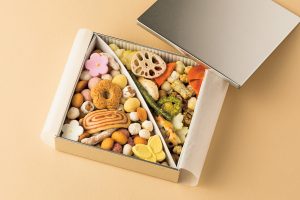 あられなどのしょっぱい系とかりんとうなどの甘い系の菓子がそれぞれ10種類以上ずつセットに。「ぽりぽりと手が止まらない無限ループ。お花やチョウチョなどのかわいいいモチーフが入るのも魅力です」(ギフトコンシェルジュの真野知子さん)。