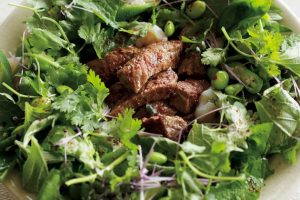 ハーブの葉をリースのように皿に盛り、真ん中に牛肉を乗せ、食べる直前に混ぜ合わせるエスニックサラダ。牛肉は塊のまま焼いて後で切り分けると食感が良くなります。
