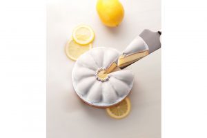 和光では例年、夏季限定でレモンの酸味がアクセントのパウンドケーキを展開。今年は、レモンの味を生かしつつ、箱を開けた時の驚きや感動があるようなデザインを一新したいと考え、グランシェフ パティシエ兼シェフ ショコラティエを務める小熊亮平氏が愛らしい花の形に仕上げた。この型は、かつて和光のアトリエで使われていたもの。現在は使用されていないが、大切に保管されていた。昔ながらの型に注目し再び利用することで、新しい中にも、レトロな愛らしさもある、見た目も味わいもスペシャルなケーキが完成した。