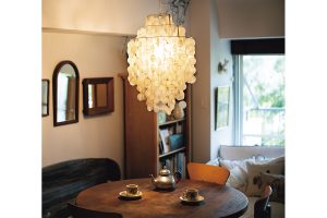 ヴァーナー・パントンがデザインした「ファン・シェル」。貝殻を円形にカットしたディスクが連なり、光を柔らかく通す。石井さんは経年変化したヴィンテージを愛用。