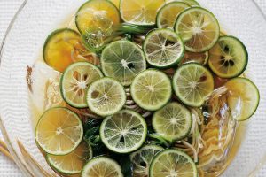 1.すだちは輪切りにして種を外し、三つ葉は根元を落とす。