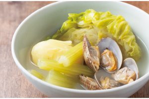 キャベツやセロリなど、食物繊維豊富な野菜に、あさりの旨みが加わった和テイストスープ。パスタを入れても良し、小鍋のスープにアレンジしても美味しくいただけます。