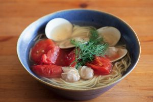1.さっぱりベトナム風、ハマグリとトマトのアジアンそば。
