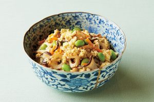 5.4に1を入れて炒り煮にし、水分が少し残っているぐらいのタイミングでむき枝豆を入れる。