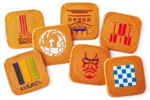 1,500円。三味線の胴に似ていることから「三味胴」と名付けられた瓦煎餅。隈取、歌舞伎座の座紋「鳳凰丸」、定式幕など、歌舞伎座にちなんだ絵が、職人の手で一枚一枚描かれている。