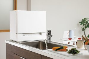 本体奥行き約29cm、ドアを開けるときに蛇口に当たりにくい設計だから、シンク横にすっきり置ける。「家族4人分の食器も一度に洗えて、除菌もできます。家事負担が減りました」