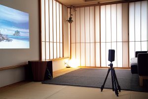 天井の照明器具に、高性能プロジェクターと高音質スピーカーを搭載。工事不要で簡単取り付け。動画サービスやテレビが手軽に楽しめる。「ケーブルがないから見た目もすっきりです」