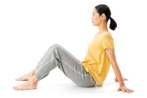 (2)どちから一方に上半身を向けて、両手をしっかりと床について、カラダを床のほうに向ける。