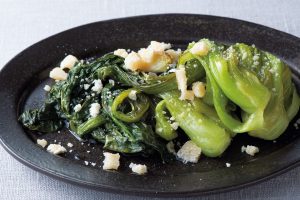 小松菜を焼きつけて、蒸したあとパルメザンチーズをぱらり。とろとろの小松菜がクセになります。白ワインと合わせたい一品。