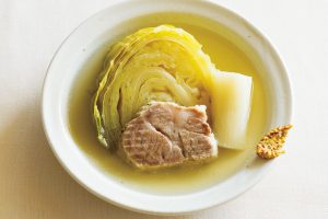 キャベツとネギと塩豚の3種類の食材しか使用しない、潔いポトフ。塩味のシンプルなスープだからこそ、具材のうまみがより一層引き立ちます。塩豚はたくさん作って、常備しても。