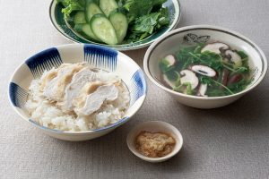 海南チキンライス風炊き込みご飯と豆苗スープ【味付けご飯と汁物2品献立レシピ】。