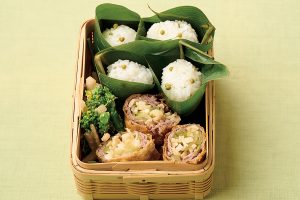 シンプルなおにぎりも笹に巻けばぐっと華やかに。東寺揚げとは、湯葉で巻いて揚げたもののこと。春らしい食材を牛肉と湯葉で巻いたボリュームある一品はお弁当にぴったり。