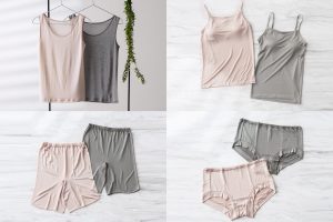 タンクトップ、カップ付きキャミソール、ボクサーショーツ、3分丈パンツの4アイテムです。