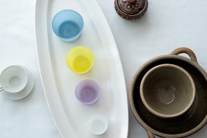 「ガラスの器は、ワインや冷たいドリンク、耐熱なら温かいお茶にも使えて、蕎麦猪口としてもちょうどいい。なかでも好きなのはカラフルな器。軽やかに色を表現できるのは、透明感のあるガラス素材ならではの魅力だと思います」