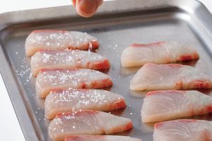 3.刺身の表面に塩(分量外)をふって10分おき(最大30分まで)、表面の水気をペーパータオルで拭く。