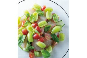 梅雨時の蒸し蒸しした日にも食欲をかき立ててくれる一皿。ぶどうの果汁が口に広がり、ドレッシング代わりになる〝口中調味〞を楽しんで。ミントの代わりにパクチーを用いれば、エスニックな味わい。生食するだけにかんぱちの下処理を忘れずに。