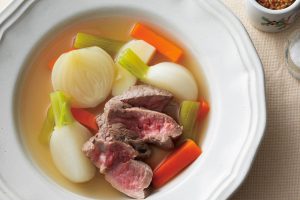 1.玉ねぎは半分に切る。にんじん、セロリは1.5cm角・5cm長さの棒状に切る。じゃがいもは縦4つ、かぶも縦4つに切る。肉はひもで縛り、両面に塩小さじ1/4を振る。
