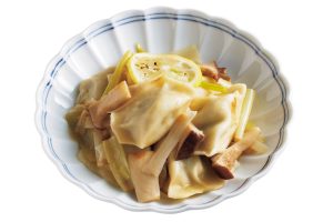 2. フライパンを熱してバター大さじ1を溶かし、1を強めの中火で炒める。色付いてきたら水餃子、レモン、Aの順に入れ、煮立ったら弱めの中火にし、蓋をして餃子の袋の表示どおり煮る。残りのバターを加えて醤油で味を調え、こしょうをふる。