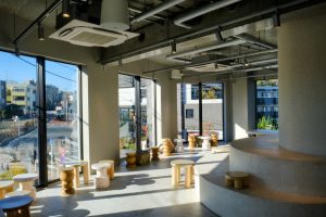 小田急線の下北沢駅から世田谷代田駅方面へ、下北線路街を進み鎌倉通りと交わるY字路。公園に隣接する二面ガラス張りの建物が「Et」です。