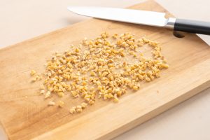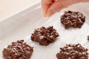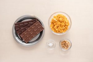 今回は、バレンタインにもぴったりな「チョコ」のおつまみ。ブラック多めの配合で作った大人のクランチチョコです。ダークなチョコの甘さと、上にかける塩が絶妙な味わいに。塩は、あれば少し良い塩を使うとさらにおいしさがアップしますよ。お好みでラムレーズンを刻んで合わせても◎。