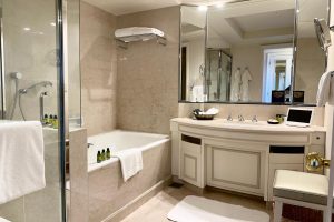 大理石が用いられたバスルーム。アメニティはロクシタン。