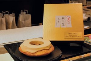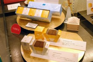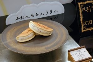 滋賀県大津の和菓子店「叶 匠壽庵」では空港にちなんだ限定商品「羽雲(プレミアムチーズ)」(1個324円)などを販売。