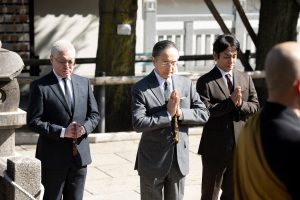 同演目の歌舞伎座での通し上演は、平成25年の新開場杮(こけら)落とし以来の12年ぶり。そして今回はAプロ・Bプロと世代を超えての豪華競演による上演という豪華さです。公演を前に、大星由良之助(史実での大石内蔵助)を演じる片岡仁左衛門さん、尾上松緑さん、片岡愛之助さんが、浅野内匠頭と内蔵助、四十七士の墓所がある東京・高輪の泉岳寺をお参りして法要に参列。意気込みを語りました。