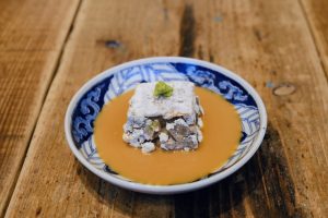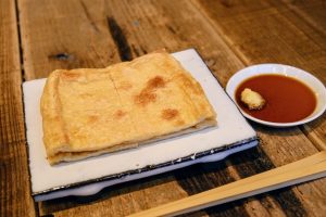 まず頼みたいのが、お店名物のおつまみを盛り合わせた「名物!天狐の定番蕎麦前盛り」。豆腐を白味噌で漬けることでまるで雲丹のような味わいに仕上げた「雲丹とうふ」や、アーモンドやクルミ、カシューナッツを西京味噌や八丁味噌、柚子や蕎麦の実と合わせた「焼きそば味噌ナッツ」、鴨のレバーペーストをラム酒で漬けた「酔っ払い鴨とあんぽ柿」など酒飲み垂涎のつまみが並びます。