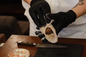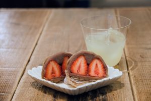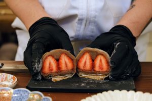 食後にはグルテンフリー、白砂糖不使用で罪悪感なく楽しめる「あなたの為に握ります!“開運一期大福”」をぜひ。西荻窪「越後鶴屋」のきび糖でつくった餡と求肥で、あまおうを包み上げています。