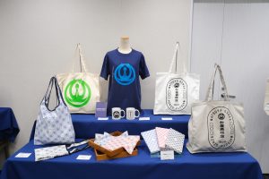 手前左から時計回りに「エコバッグ」(各3,300円)、「トートバッグ」(各4,400円)、「マグカップ」(各2,750円)、「Tシャツ」(各4,950円)、「ノート」(各2,200円)、「ハンカチ」(各1,980円)