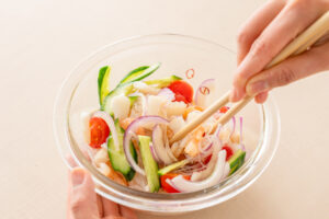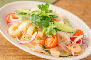 今回は、初夏にもぴったりなさっぱりとしたおつまみ。タイの春雨サラダ「ヤムウンセン」にシーフードミックスを加えた、食べごたえも抜群の一品です。つるっと食べやすい春雨と、ぷりっとしたシーフードで満足感も◎。ナンプラーと酢のさっぱり感に、にんにくと唐辛子のパンチが効いたドレッシングがやみつきになる味わいです。手軽なのにおしゃれな一皿。ぜひ作ってみてくださいね。
