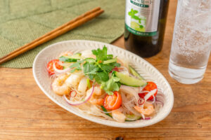 今回合わせたのは、「宝山モヒート」です。爽やかさが光る芋焼酎のソーダ割り。ピリッとした唐辛子とにんにくの効いたヤムウンセンに、ミントの香りがふわっと広がるこの焼酎が想像以上に合います。さっぱり系の料理に芋焼酎? と思いつつ一口……スパイス感と爽快さがマッチして、気づけば箸もグラスも止まらず(笑)。ピリッとした辛さをスッと流してくれる飲み口で、食中酒としてもぴったりの1杯でした。