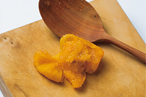 1. 木べらなどで梅の果肉を崩し、種をこそぐ。