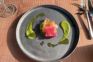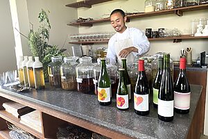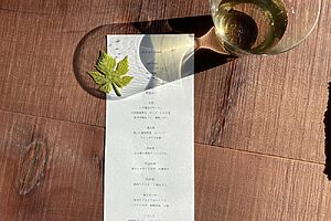 料理に合わせるのは敷地内にあるジオヒルズワイナリーのもの。醸造責任者の富岡隼人さんの奥さまがベトナム出身ということもあり、ワイナリーの名にはベトナム語で“風”を意味する「ジオ(Gió)」が用いられています。「風の吹く丘」の名にふさわしい、風通しの良い高原の地に位置しています。