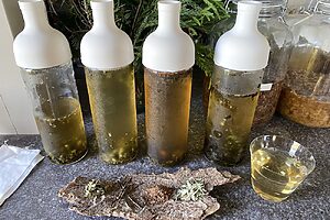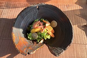 調理の際には、電気やガスを一切使用せず、フォレイジングで採取した野菜や地元で獲れた鹿肉などを、薪の火だけでじっくりと調理します。鹿肉を薪火で燻し、鰹節のように薄く削ったり、葉わさびのオイルを添えたりと、一皿にこの地ならではの食文化が表現されています。塩麹やコンブチャ(紅茶や緑茶などのお茶を発酵させて作られる発酵飲料)など、発酵の力を積極的に使っているのも特徴の一つ。